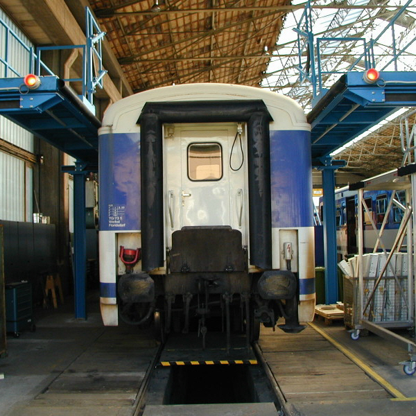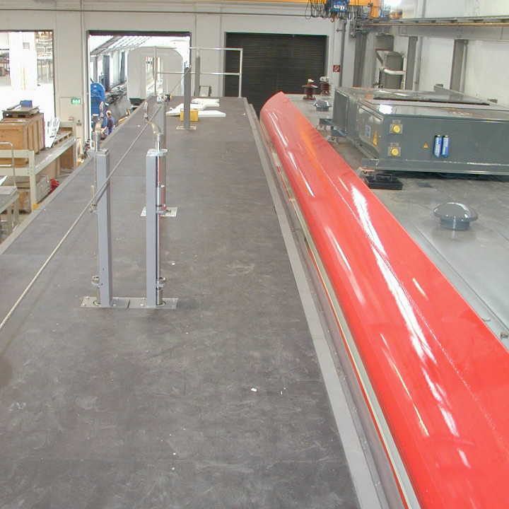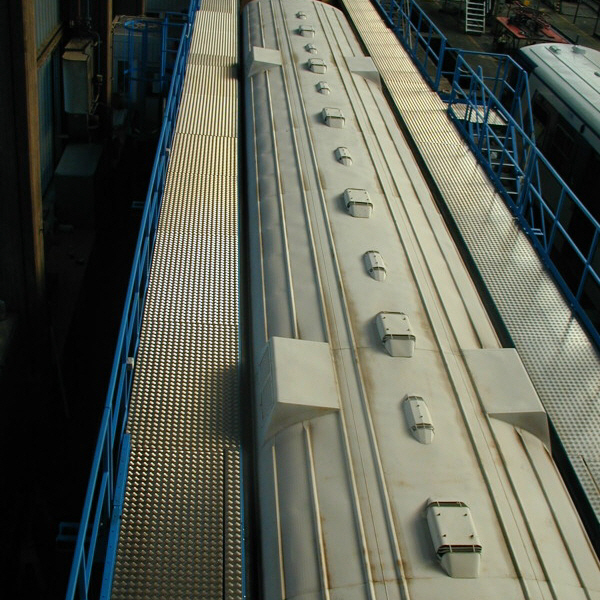 Dacharbeitsstände, DB Regio AG Halle a.d. Saale Auftraggeber: Deutsche Bahn AG Leistungen: Konzeption, Konstruktion, Fertigung und Montage, Inbetriebnahme, Service für Manuell verfahrbare Dacharbeitsstände mit Dachabschrankung und Teleskopsegment