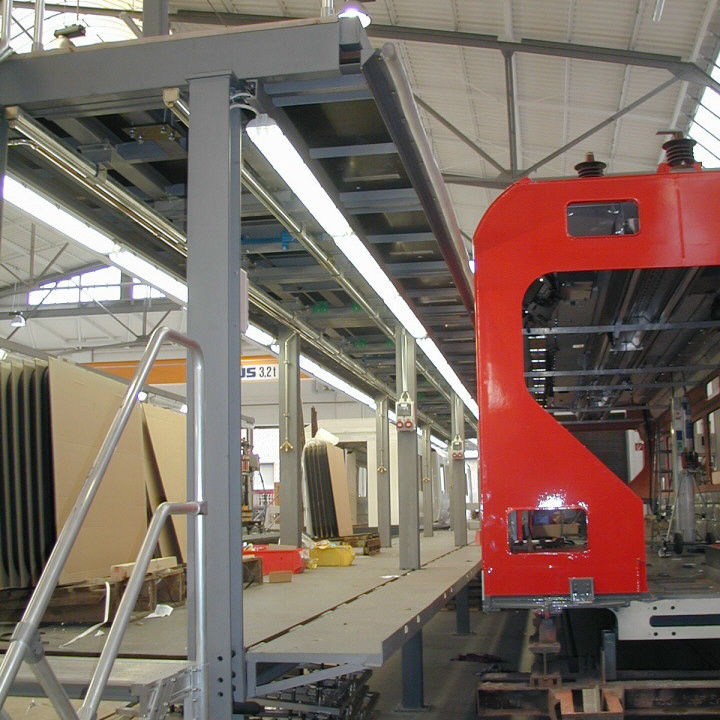 Dacharbeitsbühnen mit mobilen Kopfbühnen für ÖBB Werk Floridsdorf/Wien Auftraggeber: Zacher Leiter- und Steigtechnik GmbH Leistungen: Konzeption, Konstruktion, Fertigung und Montage, Inbetriebnahme, Service für Elektrisch verfahrbare Dacharbeitsbühnen mit mobilen Kopfbühnen